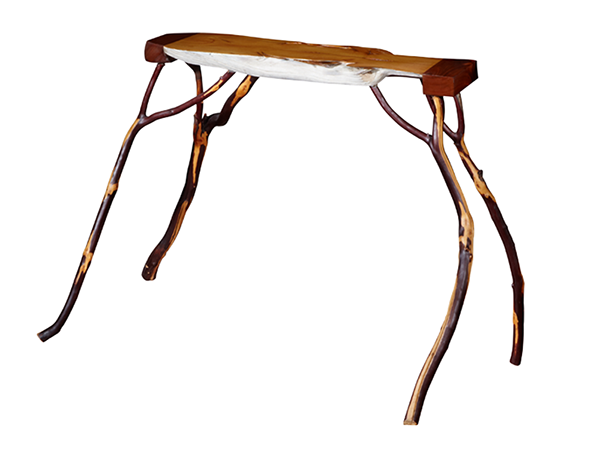 A fun micro-table contrasting the blond drift wood with the deep red of Mahogany and the deep purple of Manzanita bark. Very delicate, appearing just like a newborn fawn testing it's first legs.